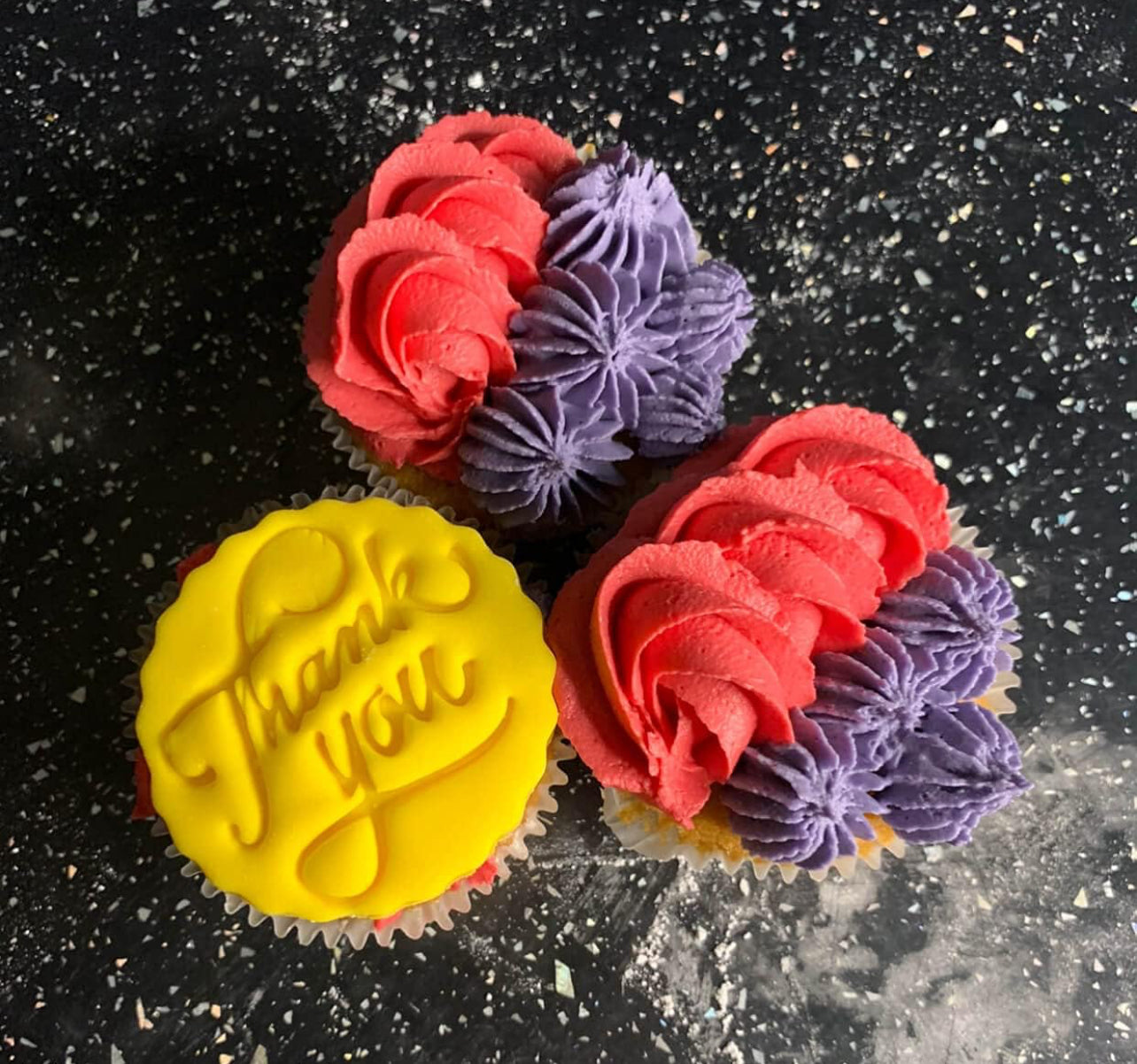 4. Voila! bake some lovely cupcakes and apply the stamped fondant icing to the cupcakes to make them stand out.
